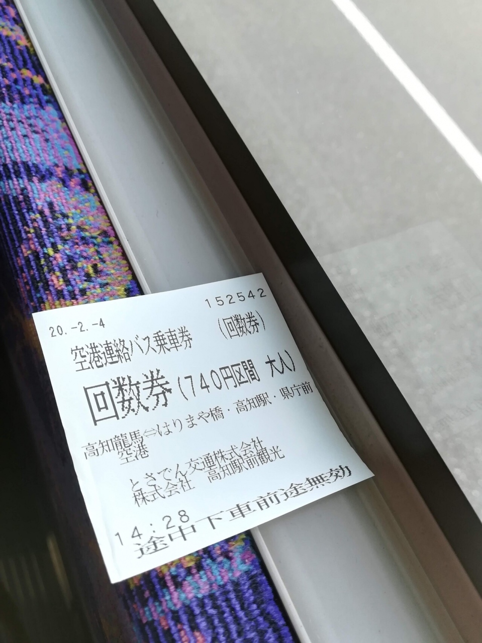 車がない方は市内まで行くにはこのバス利用になると思います。あとはタクシーのみとなります。乗車券は高知市内まで片道740円です。空港の自動販売機で往復2枚回数券も販売しています。こちら購入だと往復で100円お得です。乗車時間は30分程で市内に着きます。