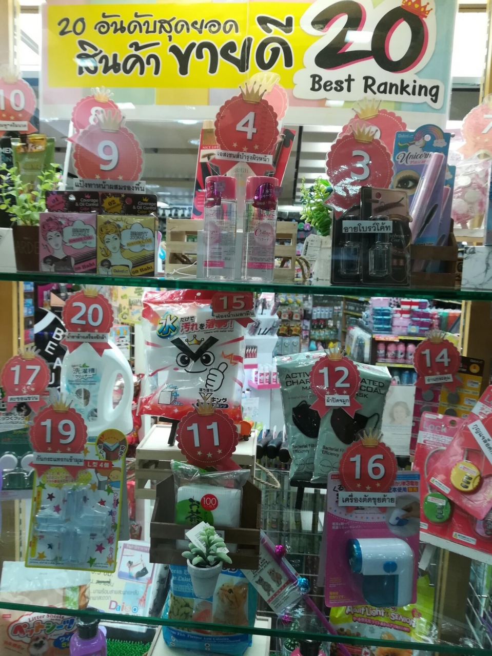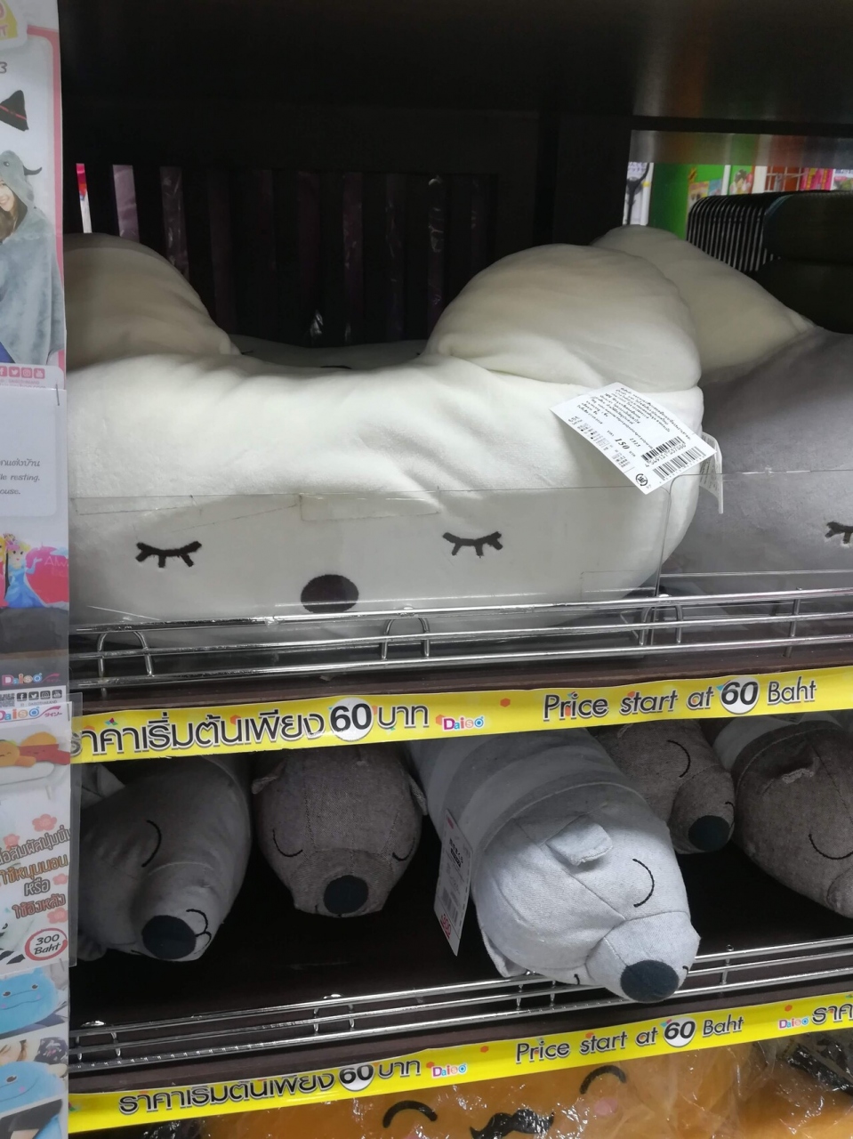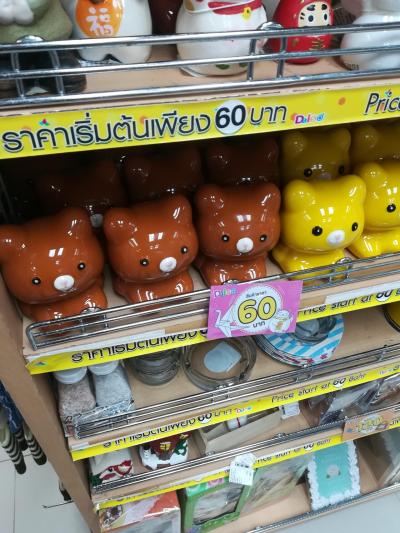 日本では100円ショップでお馴染みのダイソーですがタイだと『60Bショップ』(220円くらい)です。可愛いスリッパや貯金箱等々タイっ子のハートも掴んでいる様子であります。私の体験としてコアラのマーチを4つ買ったらバッグを進呈するという言葉につられれ衝動買いしてしまい観光のお荷物となってしまった経験があります。