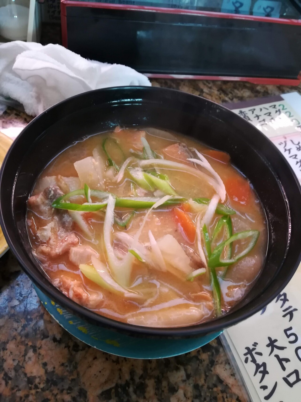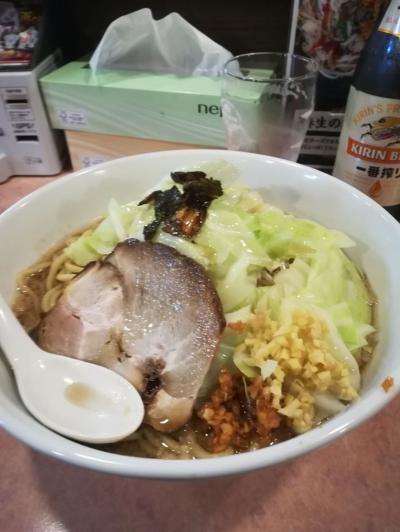 「みなせ」と読みます。席はすべてカウンター席の様子。まぜそばなど種類は結構あり。キャベツ麺の大盛りを注文。ちなみに中盛りまでは無料だそうです。プラスビールを注文。ベースは醤油とんこつのスープでしたが美味しく頂くことが出来ました。