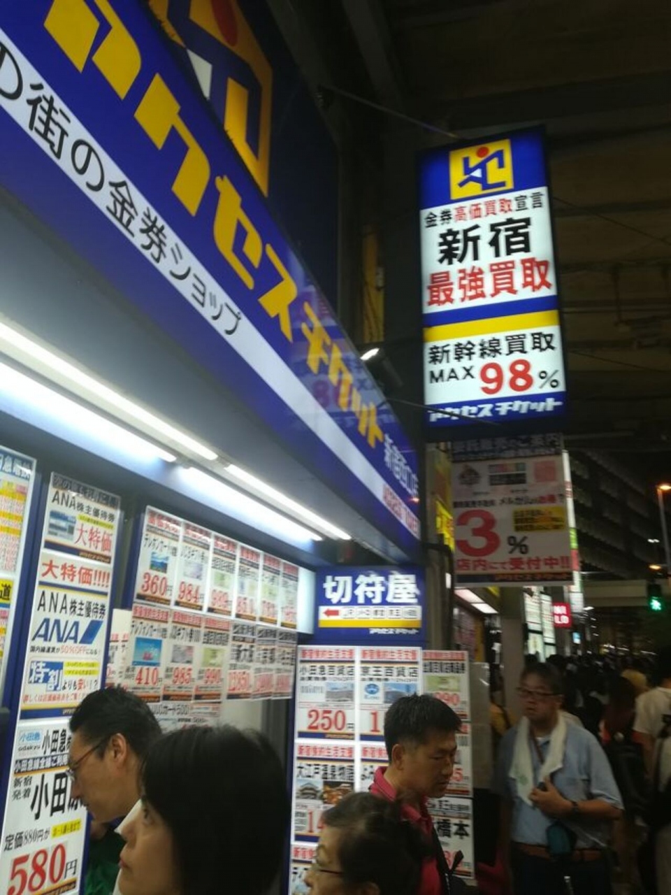 新宿駅西口の金券ショップ一帯にあるこの店舗は鉄道会社の回数券の価格が安いのでよく購入します。全日用、時差式用、休日用など種類も豊富です。株主優待乗車券なども取り扱っています。お得な切符が多数ある店だと思います。