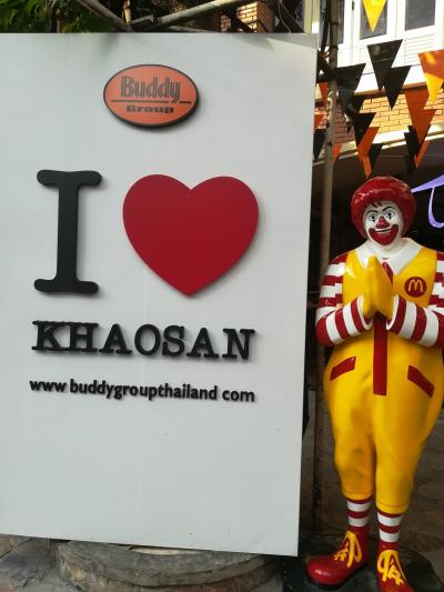タイのマクドナルドのドナルドはワーイ(合掌)をしています。『タイご当地ドナルド』でございます。なのでカオサンロードのここではよく皆様ドナルドと一緒に写真撮影をしております。横に『I LOVE KHAOSAN』とかかれていますのでそれを入れて一緒に写真撮影をしているツーリストを多くみかけます。