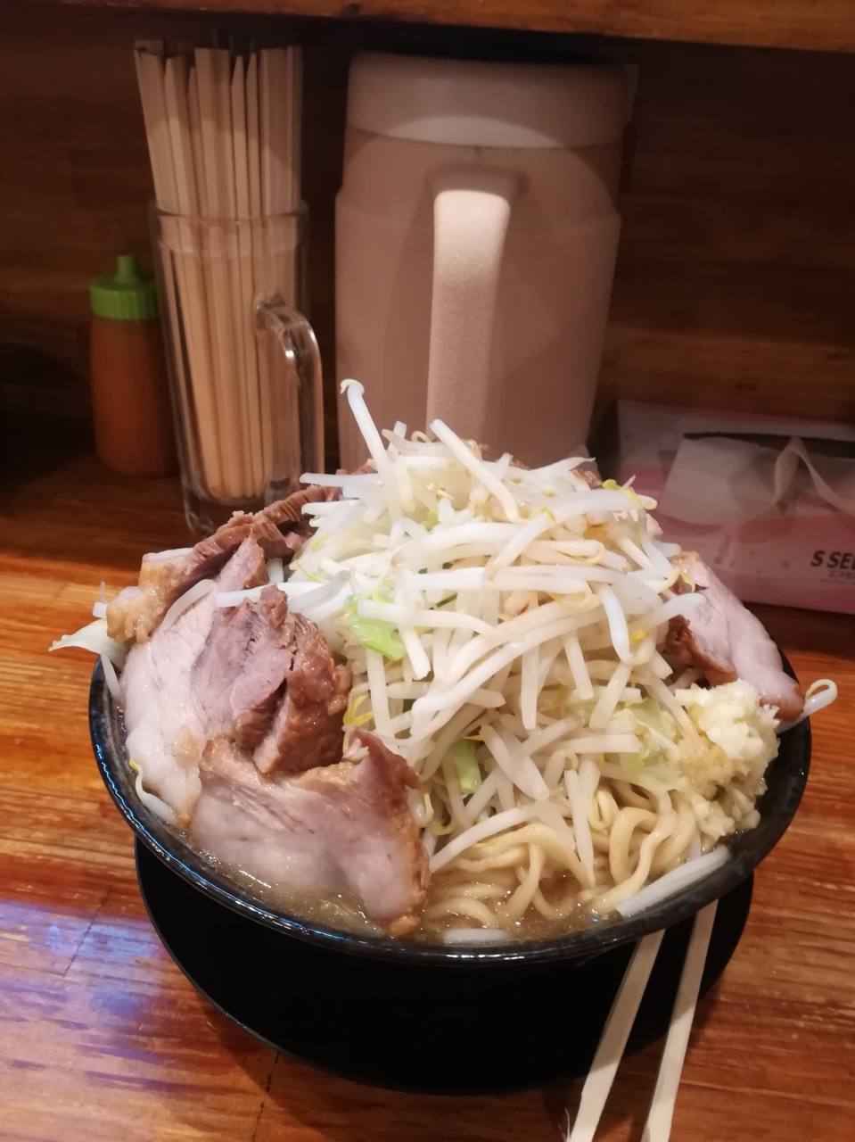 言わずと知れた「ラーメン二郎インスパイア系」ラーメン屋であります。野菜、ニンニク、油などをトッピング出来ますが「マシマシ」にすると野菜ならば1・5キロ入ります、、。低糖質食を希望の人のために麺を豆腐に代替えすることも出来ます。とにかくボリュームが凄いので普通のラーメン屋の感覚で大盛等頼んだらキツイと思います、、、。