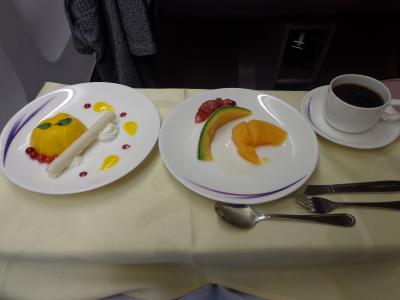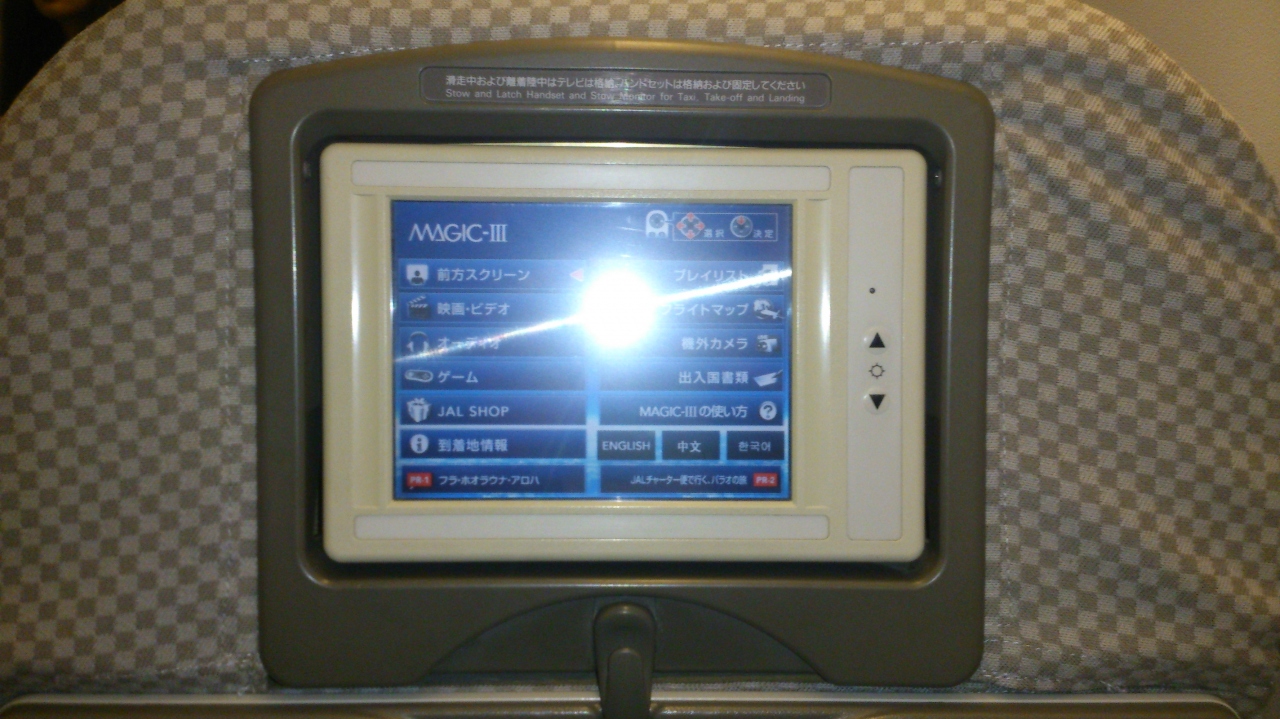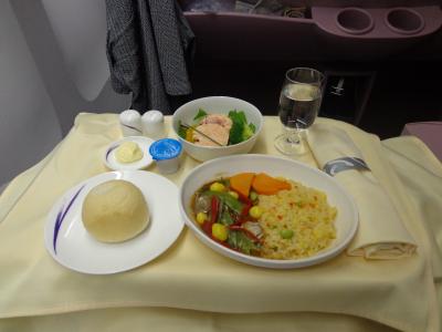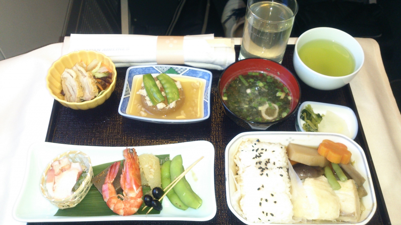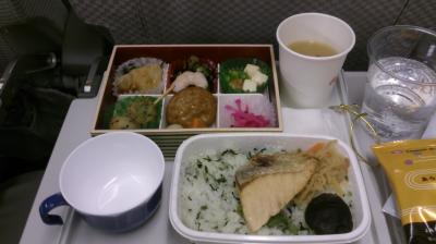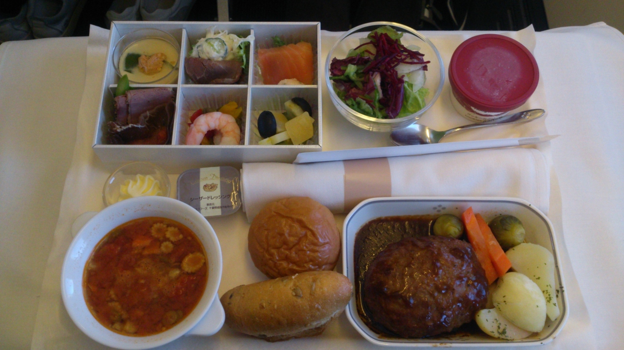 エコノミーの座席は2-4-2でした。機内食は行きの写真しかありませんが、1種類のみでした。帰りはビーフと魚が選択できました。やはり、JALなので、食事はおいしくいただきました。
