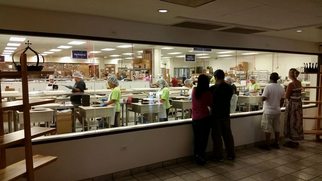 ハワイのお土産で有名な「ビッグアイランドキャンディーズ」の工場へ行ってきました。入ったらまずコーヒーとクッキーを渡してくれて、ほとんどのスタッフが日本語対応できる方のようでした。一番驚いたのがクッキー、チョコを製作している工程が全て窓越しで見えるようになっていること!「安全」であることをお客様に自信を持って披露しているのです。これは素晴らしい姿勢だと思いましたね。