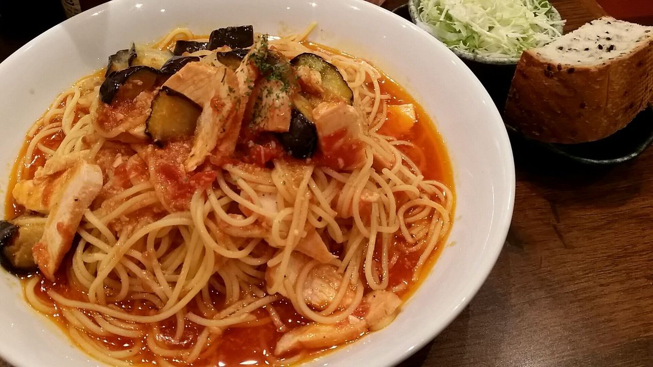 がっつりパスタが食べたくなり、久しぶりにランチに来ました。以前来たときとメニューも変わってなく、自分が好きなソースのベースと具を選ぶシステム。ピリ辛ソースに茄子とスモークチキンを選択し、中盛りと大盛は無料サービスなので中盛りを!相変わらずのボリューム感!ピリ辛ソースもにんにくがちょっときいていて美味しかった。