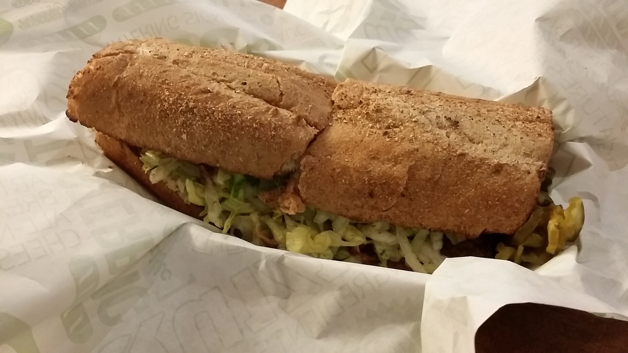 ハワイ空港で出発まで時間があり、機内食は食べずに寝たかったのでここで最後の食事を済ませました。サブウェイのようなチェーン店とのことですが、さすがアメリカ、かなりボリューミーです!一本を食べきるのに苦労しましたが、野菜もたっぷり入っていて美味しかったです。