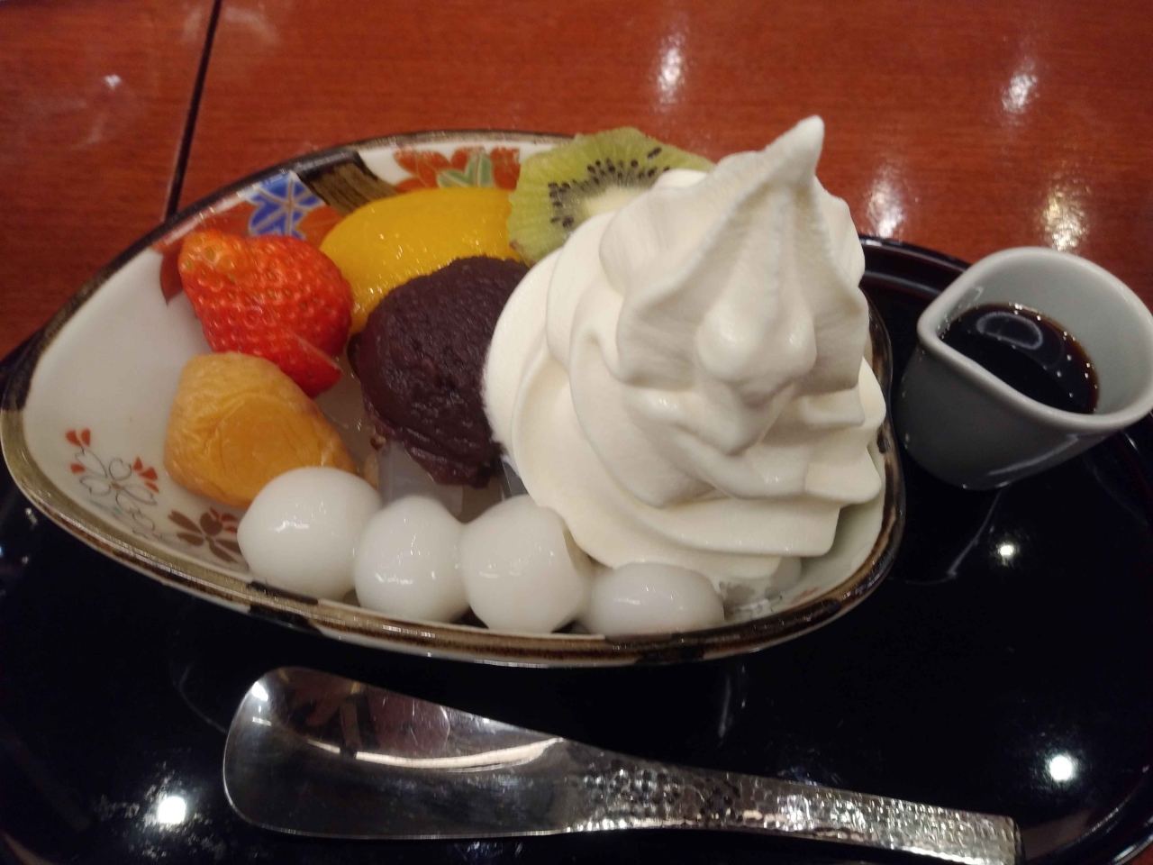 ぜんざいが食べたかったけど百貨店の中が暑かったのでクリームあんみつに変更。クリームは生クリームかと思ったのですがソフトクリームでだいぶすずまりました。