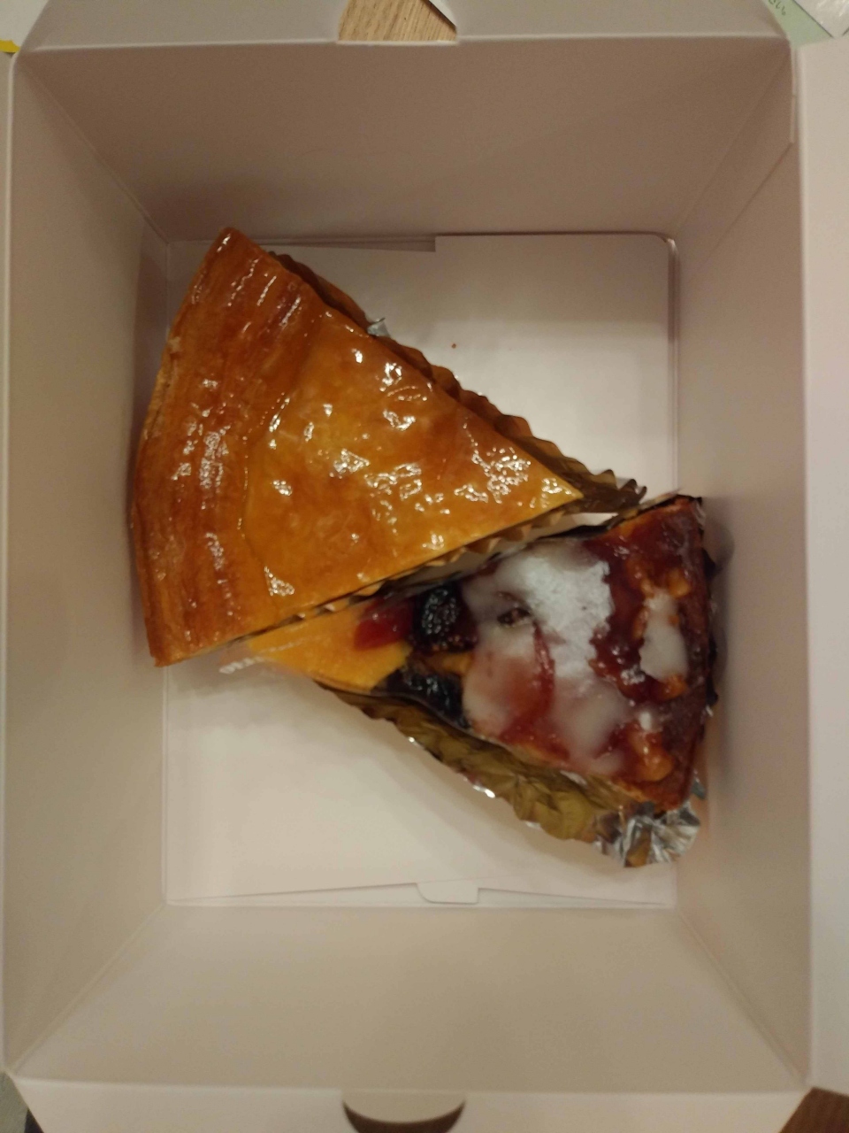 個人的にはこちらはミックスサンドがすごく美味しいと思うのですがケーキのテイクアウトです。アップルパイと、名前を覚えてないのですがキルシュトルテ風のカスタードケーキにしました。アップルパイは普通でしたがこのカスタードケーキがすごく美味しかったです。