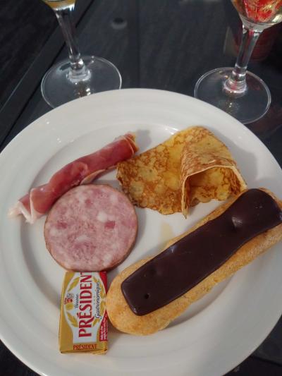 CDGのスタアララウンジは二度目ですが、お料理が美味しいし、フランスっぽいお料理があるので最後までフランスを楽しめていいなって思います。この時はお昼前ぐらいのフライトだったので軽食中心でしたがクレープがけっこうおいしかったです。あとワインが豊富なのもフランスっぽくていいと思います。
