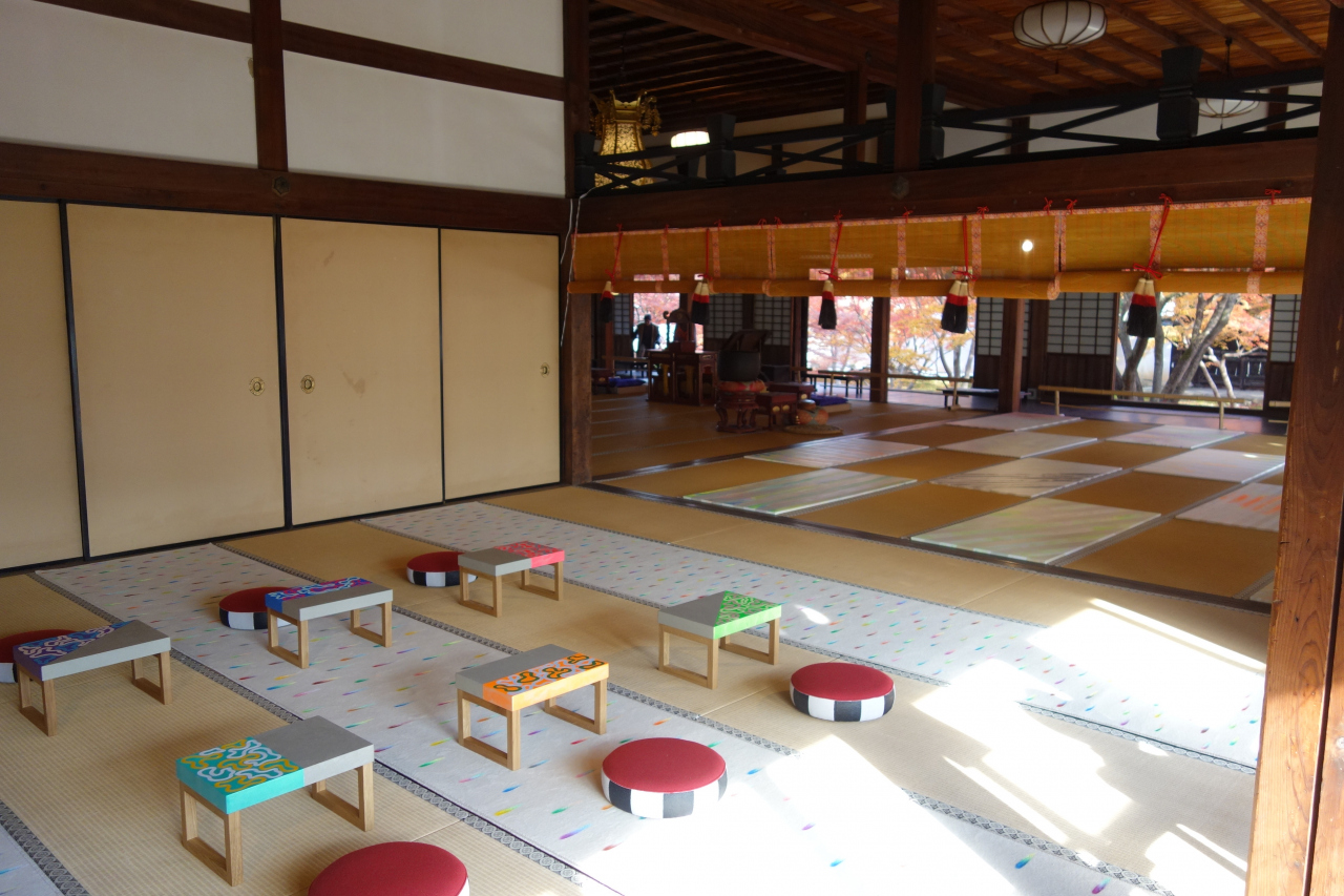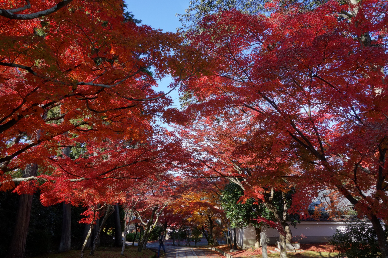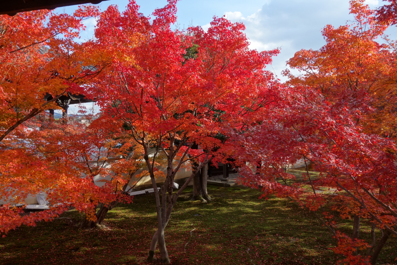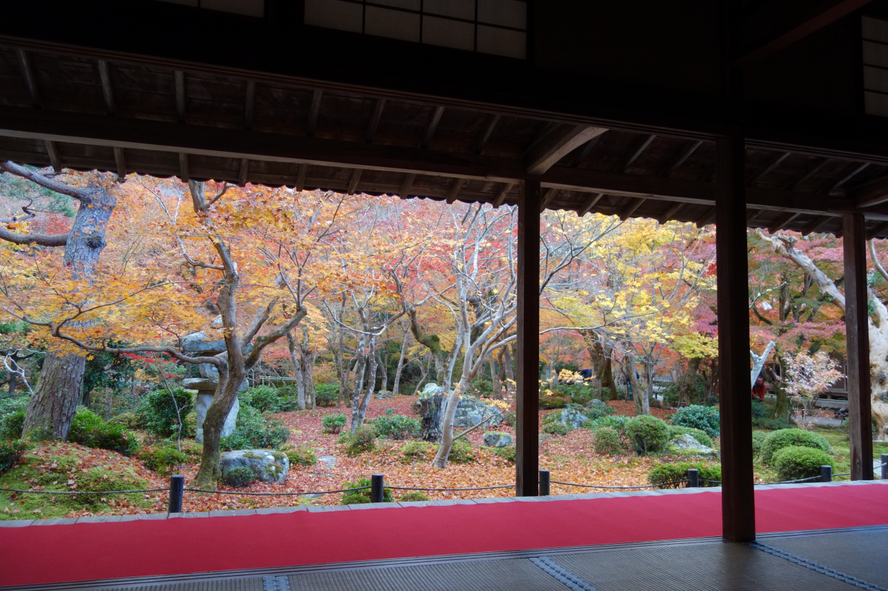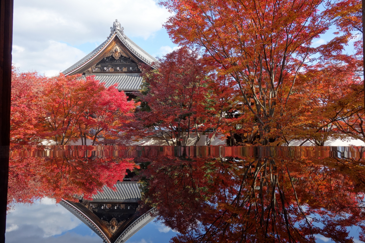 本堂に面している庭園には、多くのモミジが植えられており、紅葉の季節は真っ赤に染まります。本堂には磨き上げられた机が置かれており、リフレクション写真を撮ることも出来ます。- 旅行時期