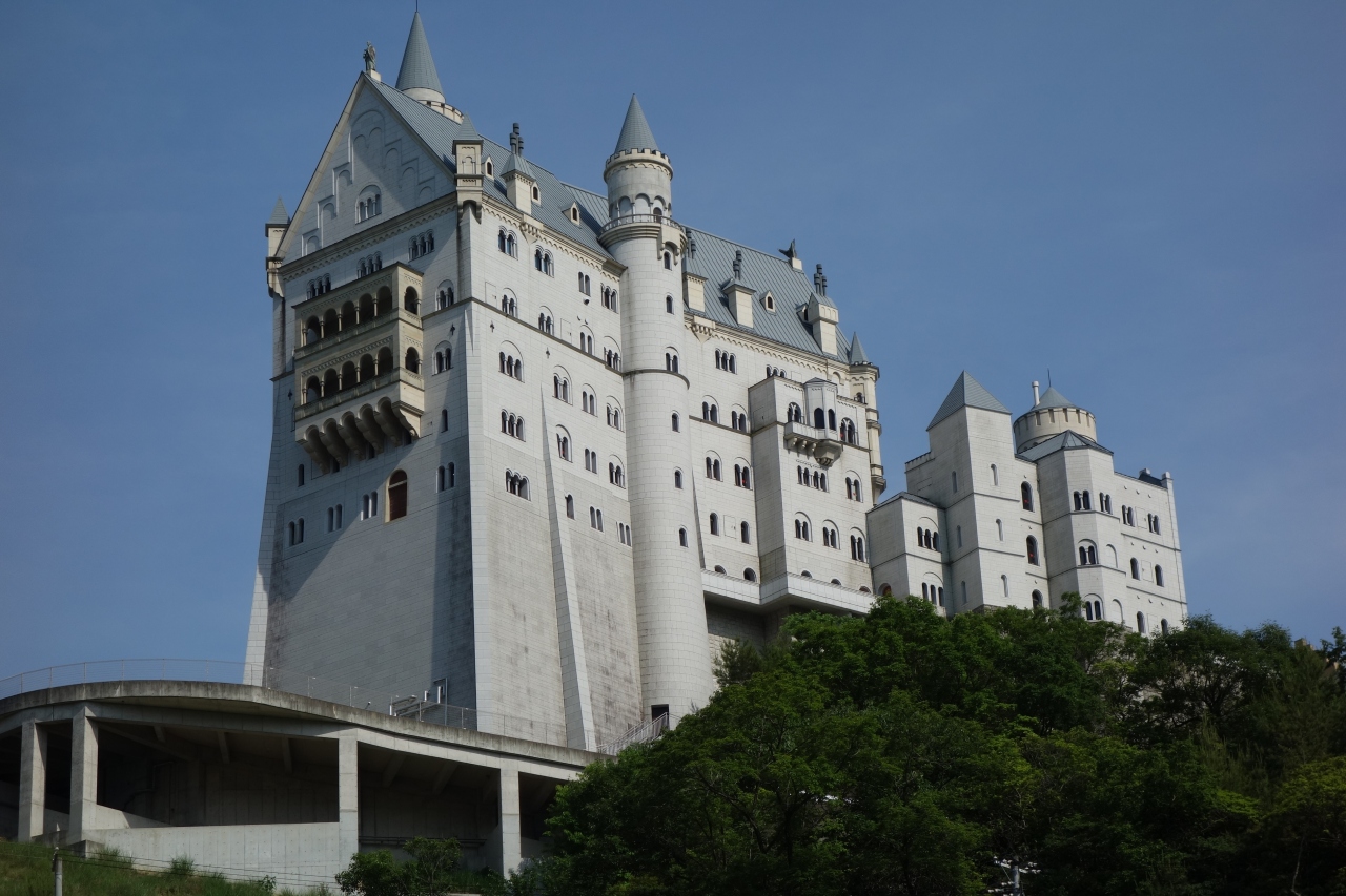 山上に立つ欧風の城と広大なエリアに多数の石像が並び立つテーマパーク