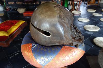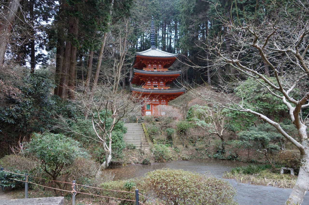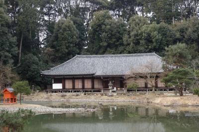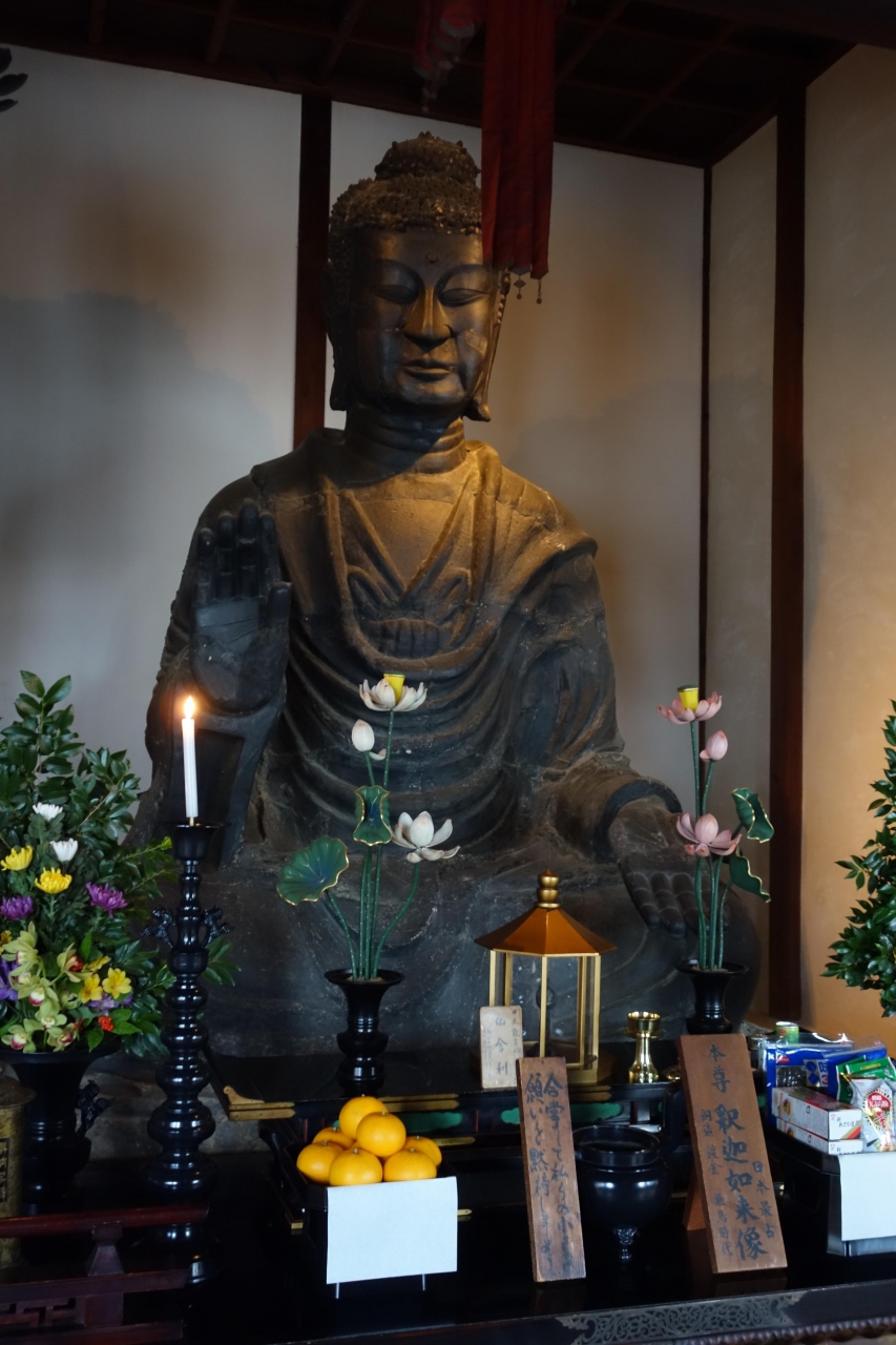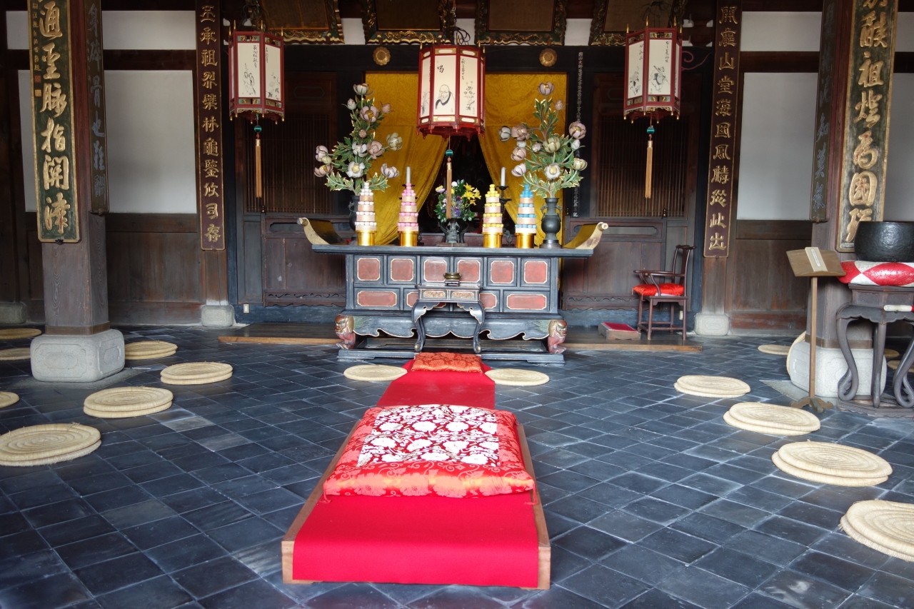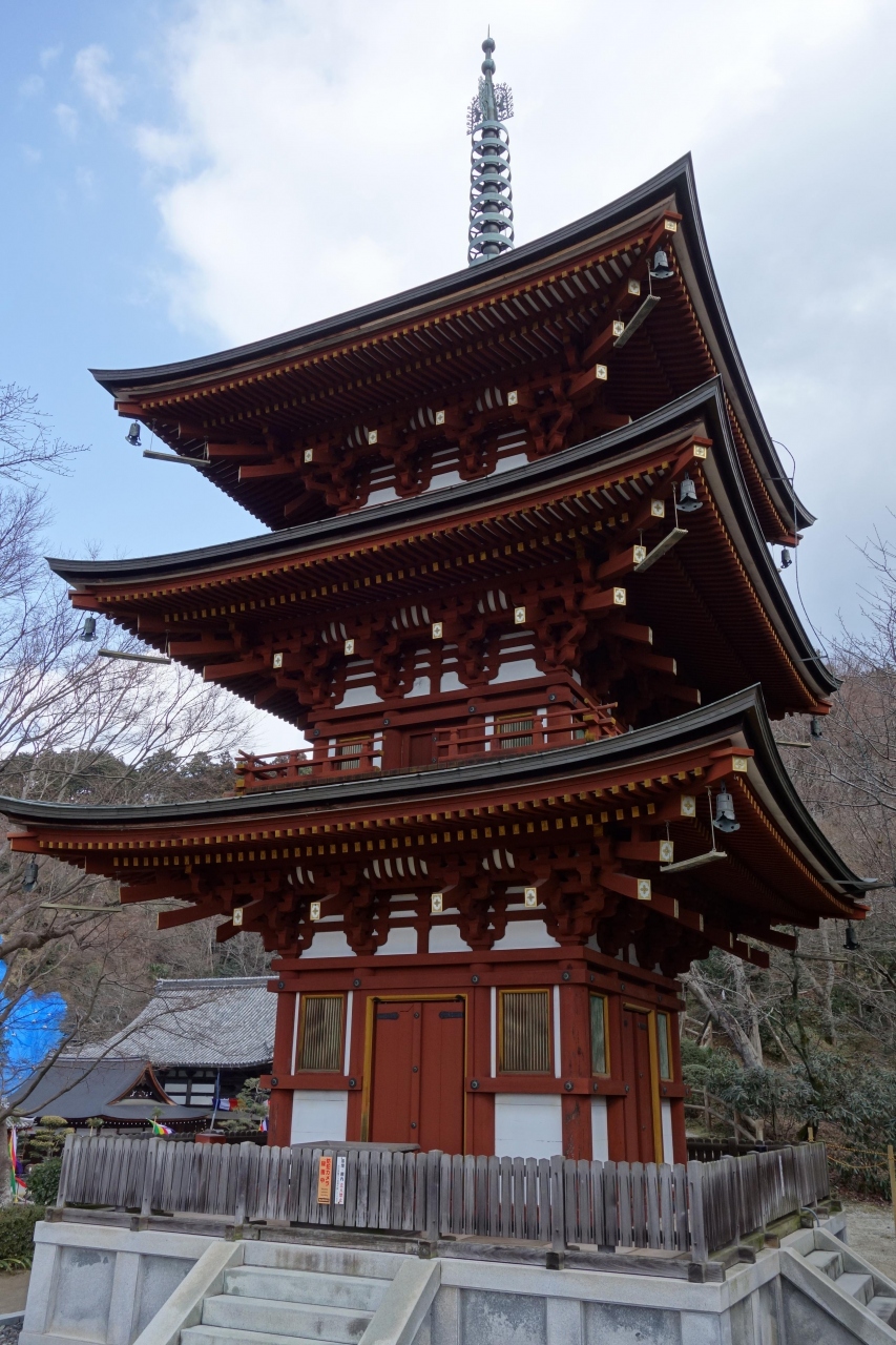 大きな寺院ではありませんが、境内の真ん中に大きな池があり、9体の阿弥陀が安置されている本堂と朱い三重の塔が、池を挟んで向かい合っています。