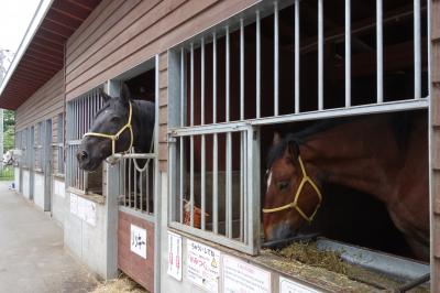 競馬場にある厩舎では、競走馬ににんじんをあげたりして、