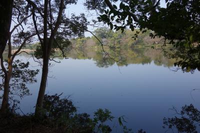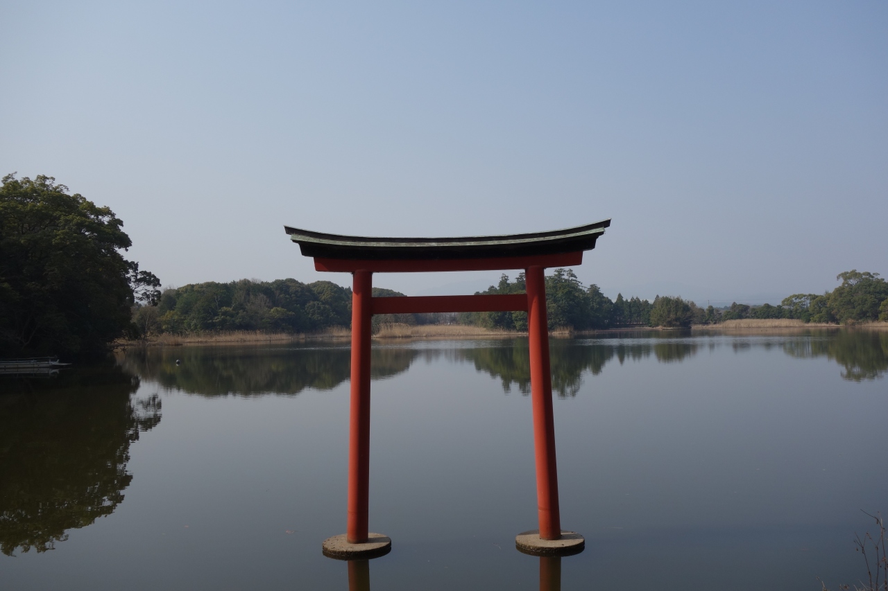 社殿の裏側には、ご神体であり内宮でもある大きな三角池が広がっています。
