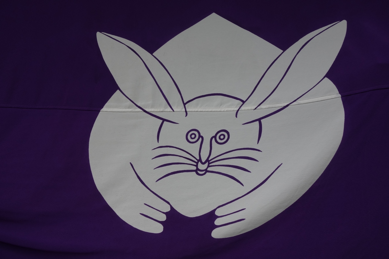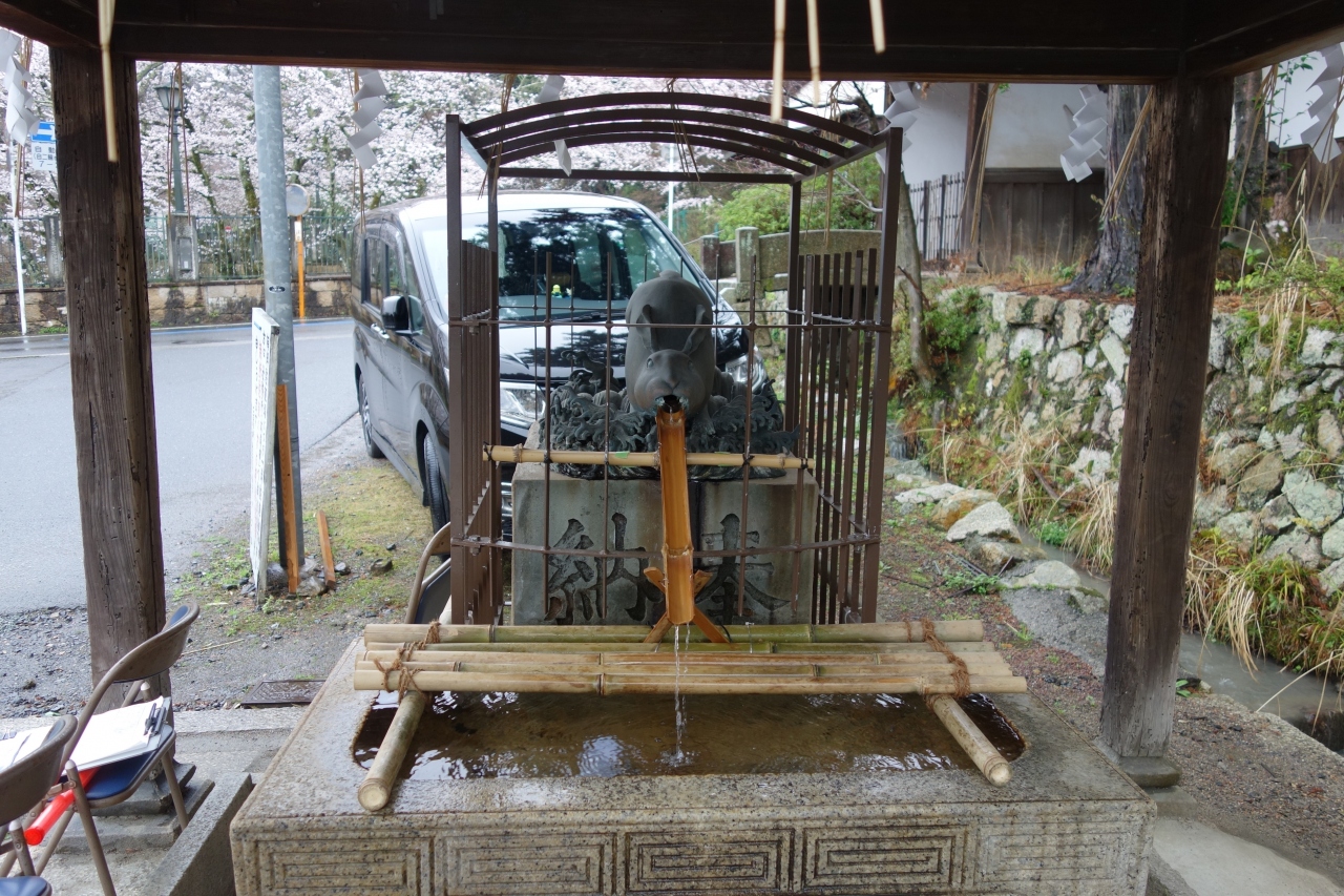 ウサギの口から水が流れ、拝殿に架かる神社幕の紋もウサギです。