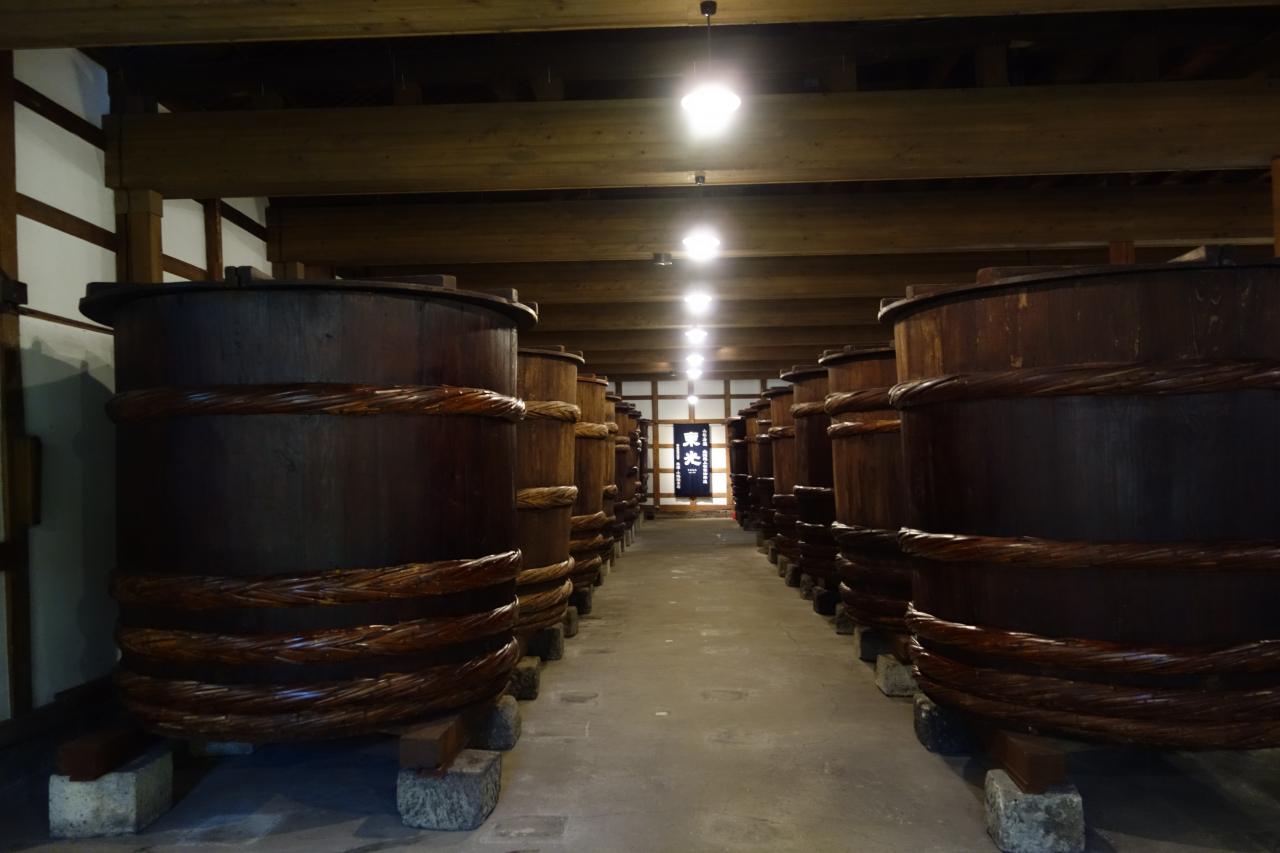東北最大級の仕込み蔵の中に大きな樽がずらりと並んだ様子は壮観です。