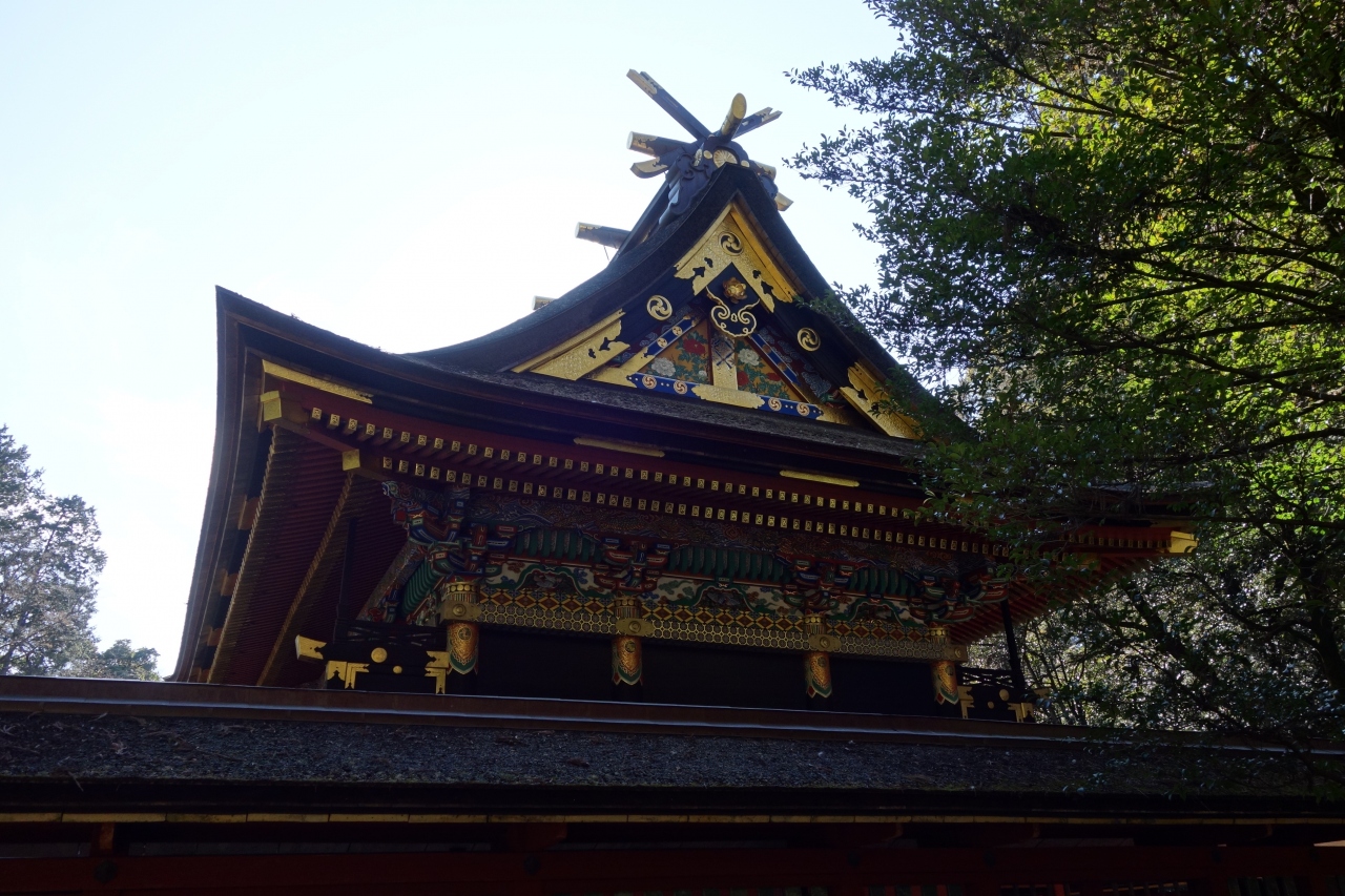 平成の大改修で塗り直された朱漆塗りの楼門や拝殿、本殿は、美しい状態に