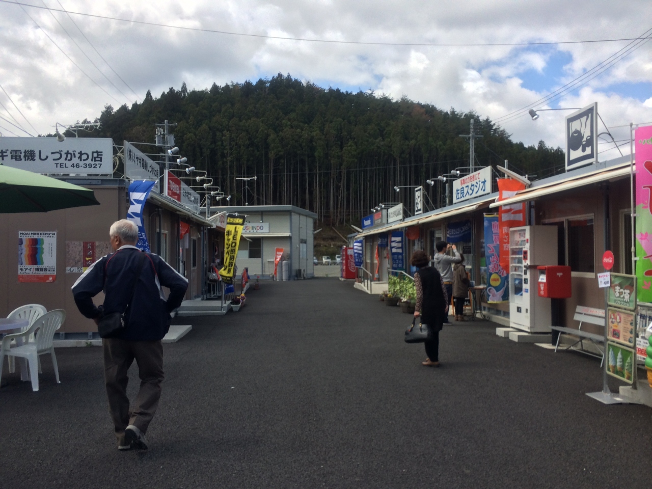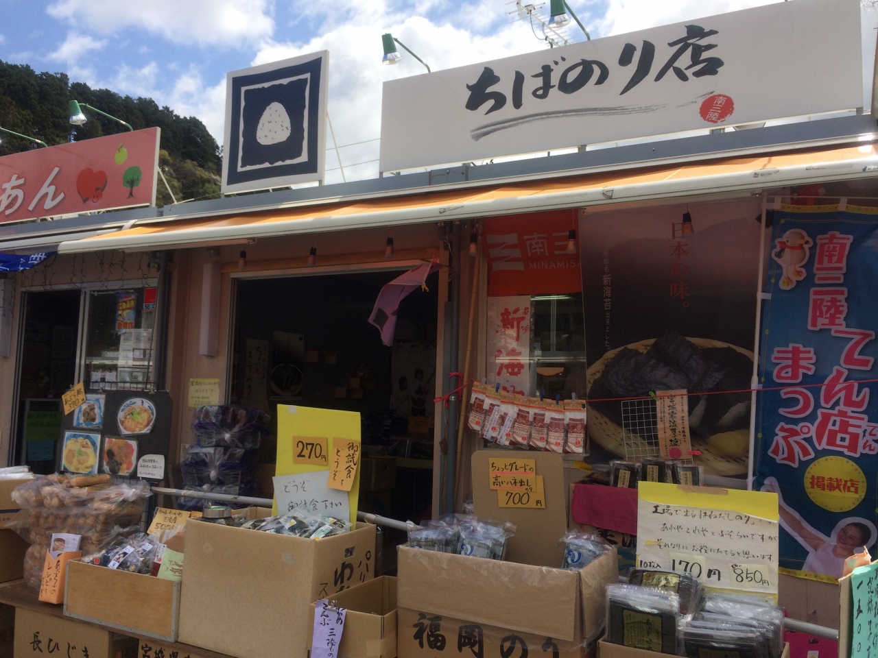 町の中心部の8割が被災したという南三陸町の仮設商店街。肉屋、パン屋、魚屋、乾物屋などから整骨院、床屋さんまで、いろいろな店舗が集まっています。ラーメン屋さんなどもありました。すぐ近くにはJRバスの駅や大きな駐車場があるので、観光客でも行きやすい場所にあります。
