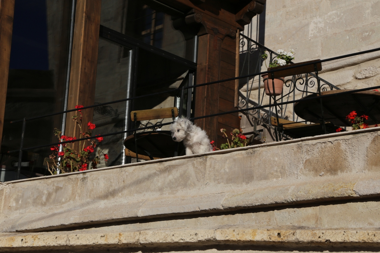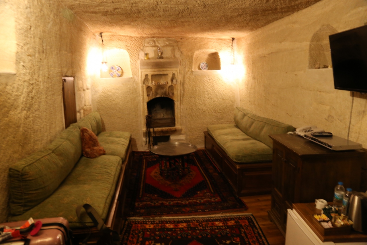 ギョレメの中心地から、少し坂を登ったところにありますが、歩けない距離ではないです。10月の頭でしたが、最初の日の晩遅くついたときは、結構寒くて部屋にあったオイルヒーターを付けました。WiFiは部屋でもつながったけれど、速度は遅めでした。
