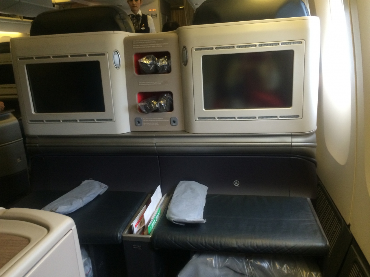 シートはフルフラットで、足下も広くていいのですが、なぜか私の席は行きも帰りもリクライニングに問題がありました。故障しやすい仕様なのか、メンテナンスが悪いのか??