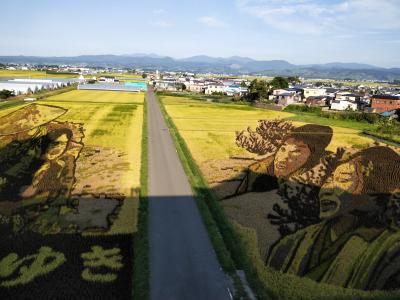 奥入瀬から青森空港へ向かう途中で寄りました。300円の利用料金を払って、目の前にある役所?の建物の上にある展望台から見ると、見事な絵として楽しめます。2箇所の会場でやっているようですが、この第一会場の方の今年のテーマはおしん。建物の中には歴代のたんぼアートの写真も飾ってありました。