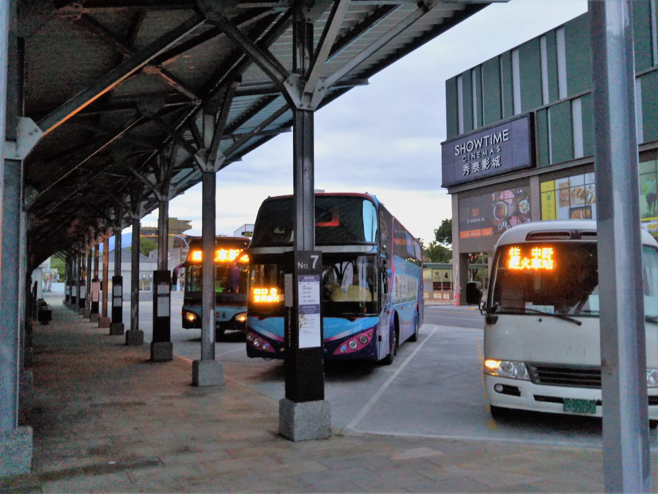 故宮博物院南館、阿里山森林遊楽区などへのバスは駅前から発着です。駅前バスターミナルはシンプルで、待合室や切符売り場、出発時間を知らせるデジタル表示などはないです。- 旅行時期