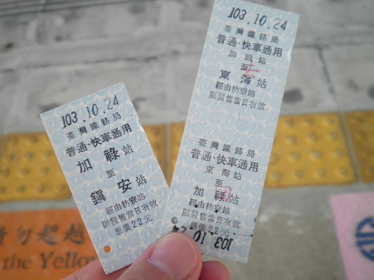 吉祥切符の硬券を買いました。加禄→東海と加禄→鎮安の二種類買いましたが、東海行きは売り切れ(在庫がない状態)ていて、往復切符を買うことになりました。また、窓口に駅員さんはいないし、切符販売機は撤去されているしと、かなりさびれていました。駅員さんは奥にいたので呼んできて切符を売ってもらいましたが、ちゃんと駅で切符を買って乗車しないと、車内購入は割増料金だそうです。(一応有人駅ですからね)- 旅行時期