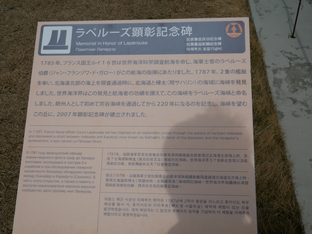 宗谷公園にあります。あまり大きくはないのですが、海に面して建っているきれいな碑です。ルイ国王の命を受けてヨーロッパ人として初めて宗谷海峡を航行したフランス人のラ・ペルーズという方の功績を讃えて造られた碑だそうです。