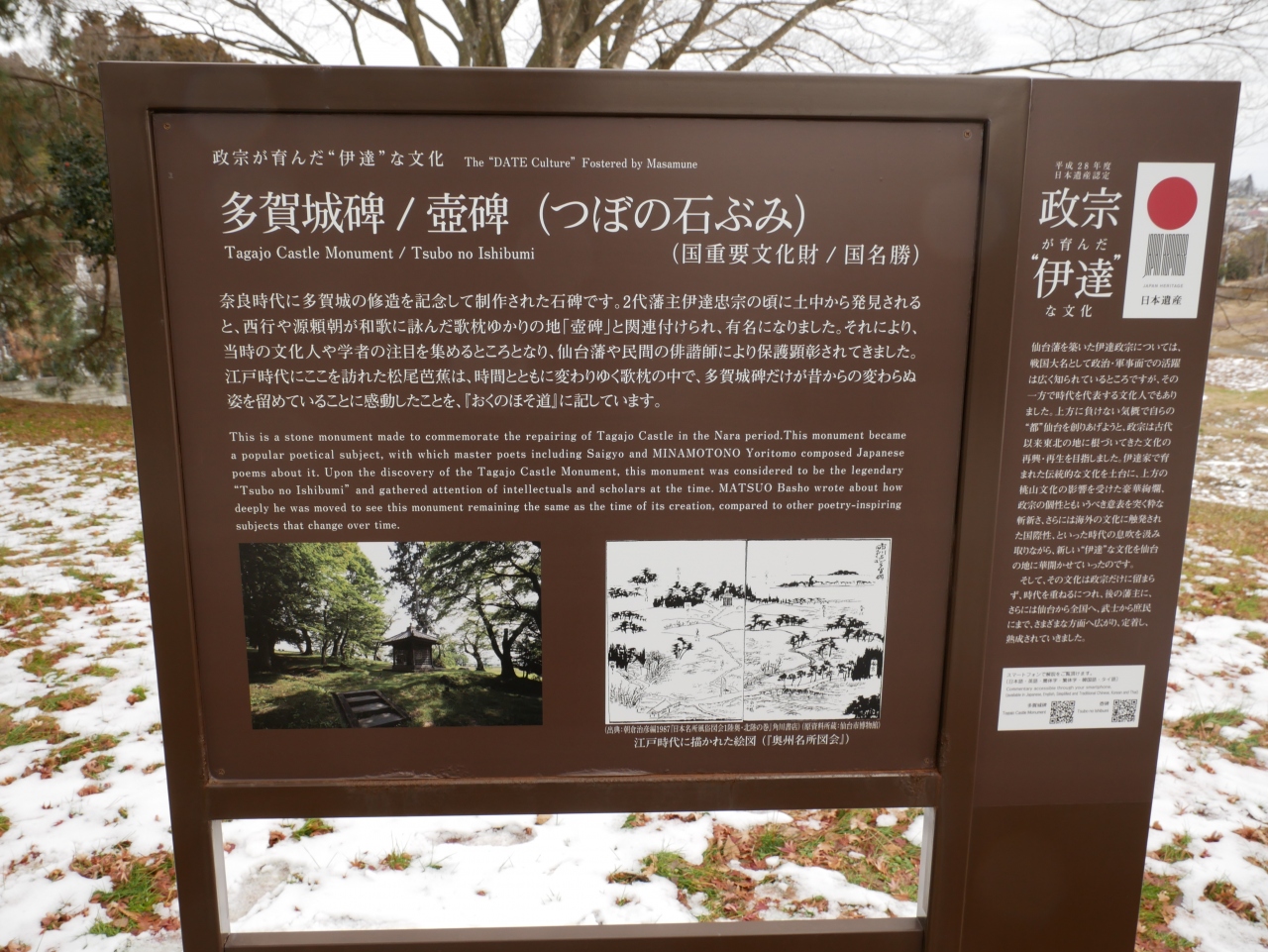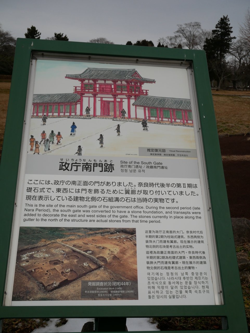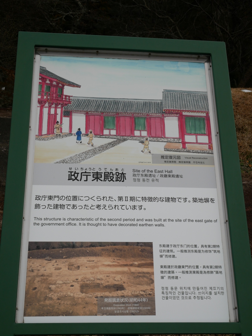 ちょっと長い階段(といっても、段差の少ない一段の長い階段ですが)を上がると、案内板があります。建物はないんですが、柱の跡みたいのは残っているので、復元図を見ながら、こんなに広いんだ、みたいなスケールの大きさは感じられます。