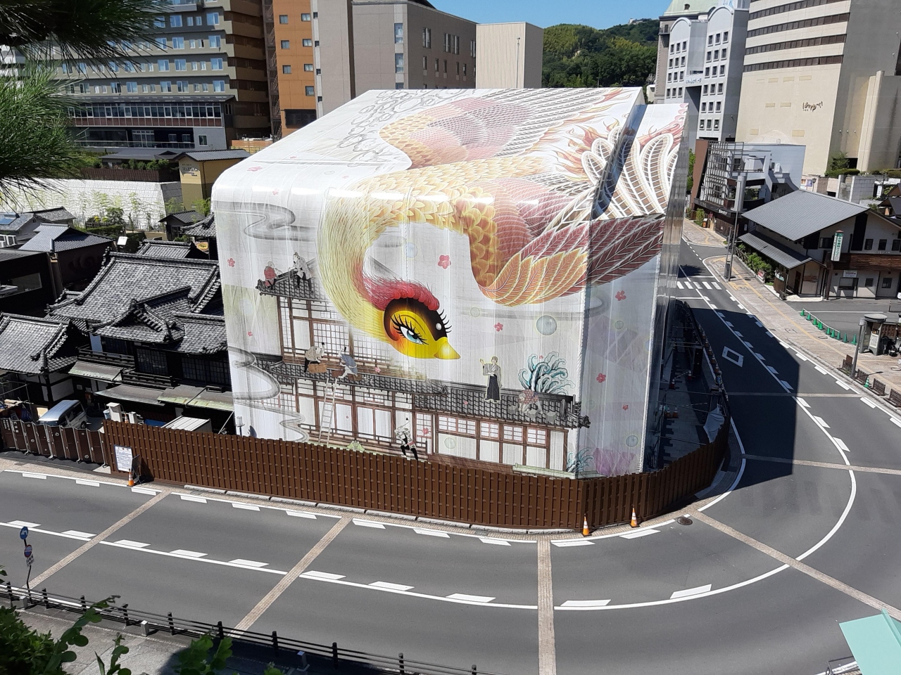 逆に、工事中なので、ほぼ全体が火の鳥のシートで覆われていますので、これはこれで見どころかも。