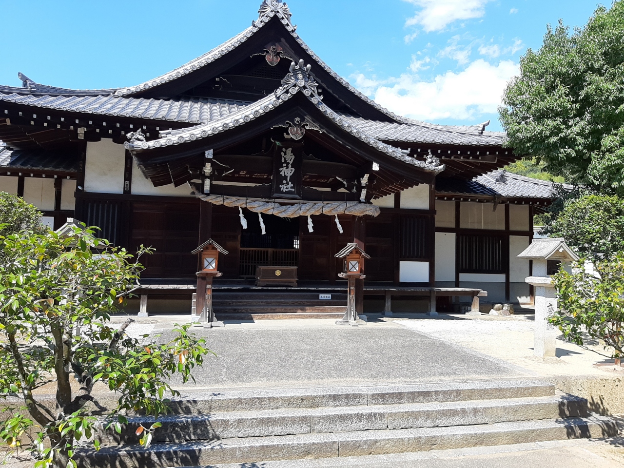 道後公園から道後温泉本館に向かっていく途中にありました。ちょっと小高い所に立っている神社で、道後温泉のお湯の守り神的神社だそうです。