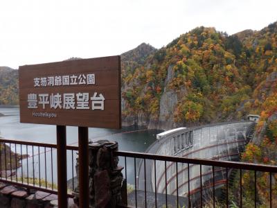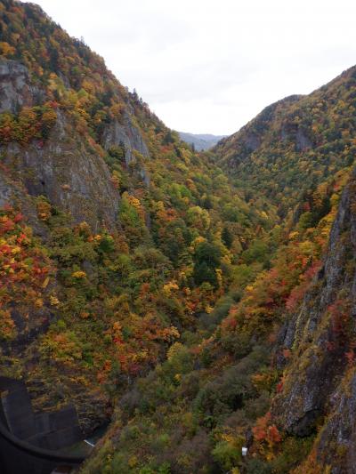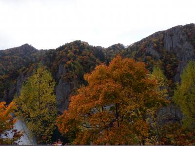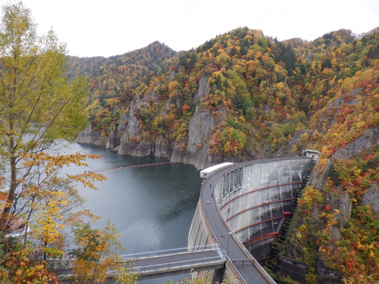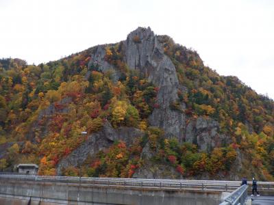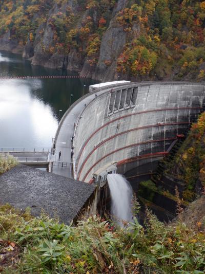 展望台からは、ダム全体が上から見渡せて、ダムの水と、岩山の紅葉がとっても綺麗でした。また、観光用の放水もやってくれていました(ちょっと、しょぼい放水ですが)。