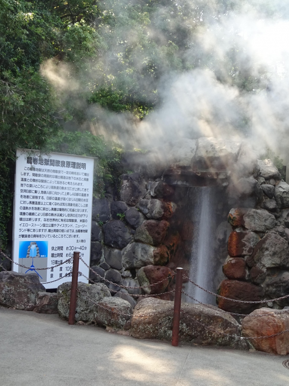 正直、噴出する規模はさほど大きくなく、しかも、安全のためとはいえ、けっこう低い位置にふたをして上にお湯が上がらないようにしているので、他の地方の間欠泉に比べても迫力はあまりありません。