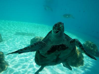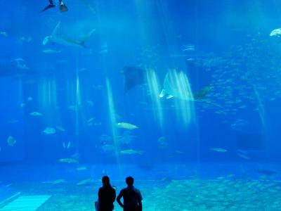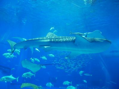 目玉のジンベイザメは、たくさんのエイに混じって、1匹だけは、ちょっと寂しそうでしたが、ゆっくり泳いでいました。