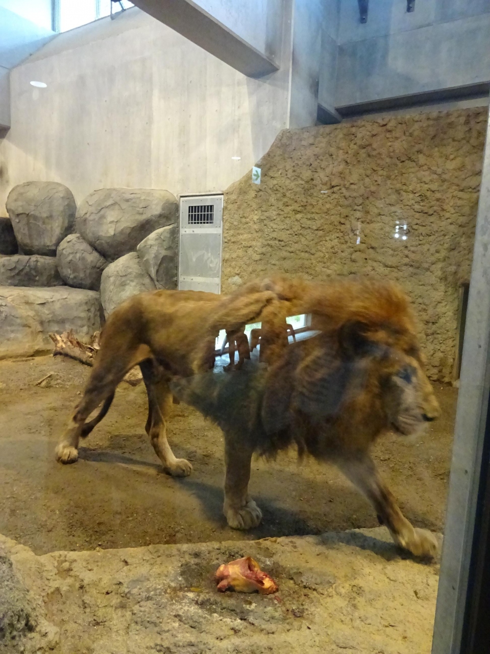 たまたまかもしれませんが、ここの動物園のいいところは、動物たちが元気に動き回っているところ。ゾウたちは食事中でしたし、ライオンも部屋の中を動き回っていましたし、