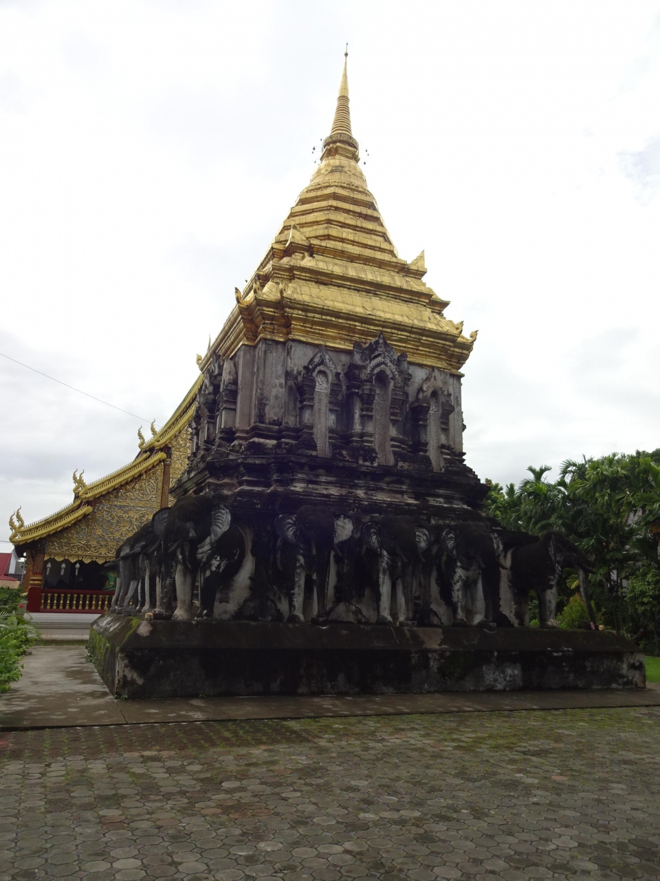 本堂もそうですが、裏手にある象に支えられている四角い仏塔も、これまたいい雰囲気。