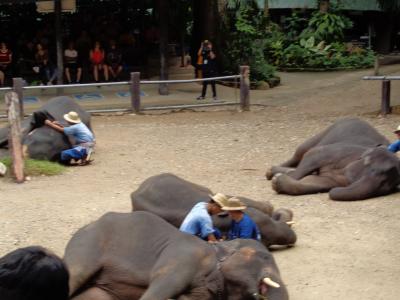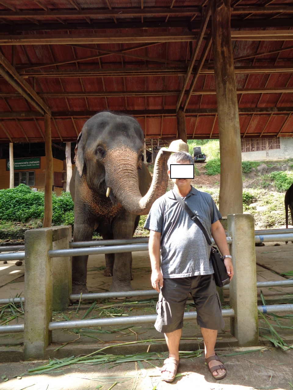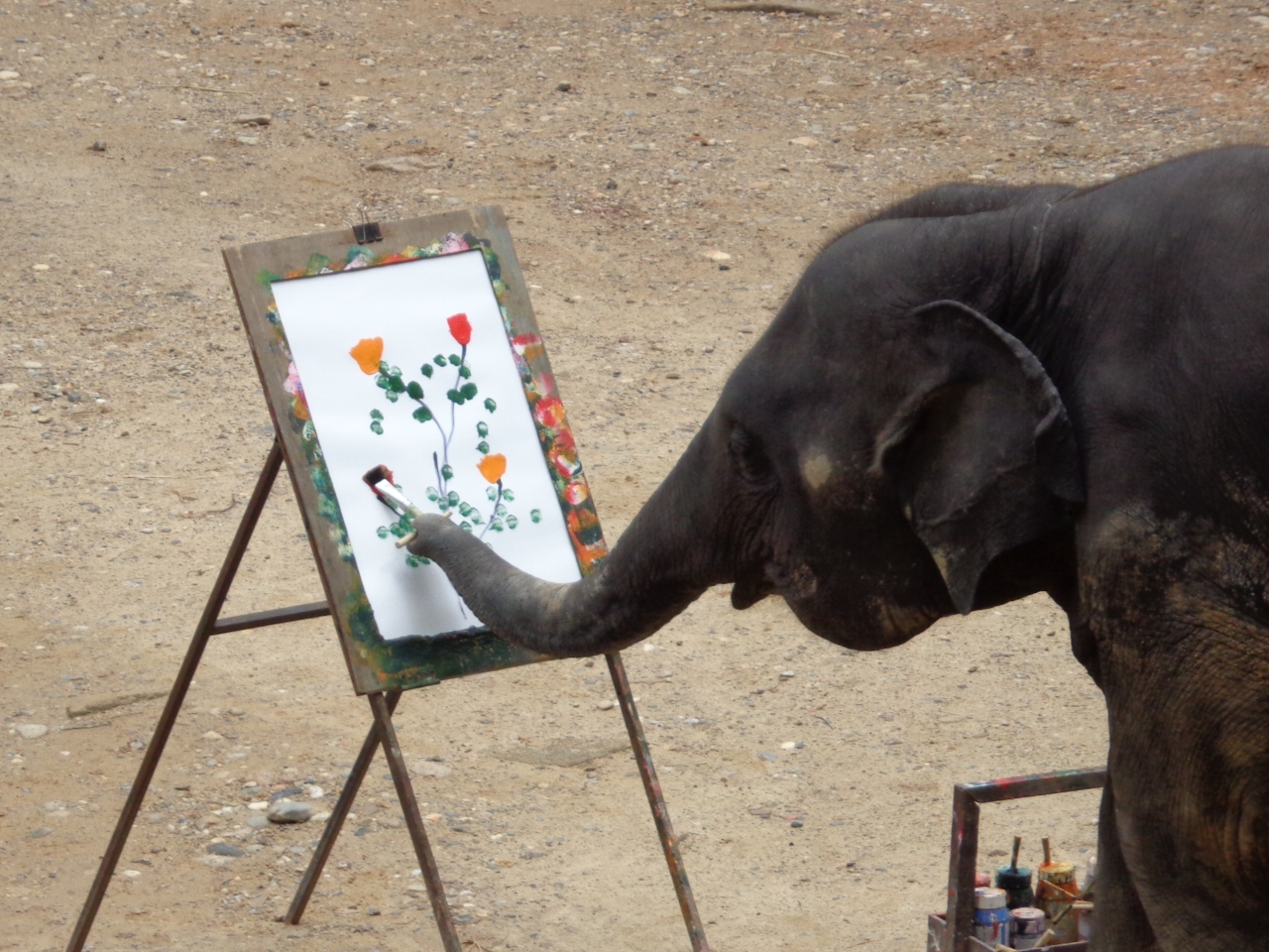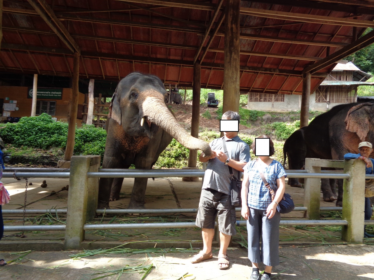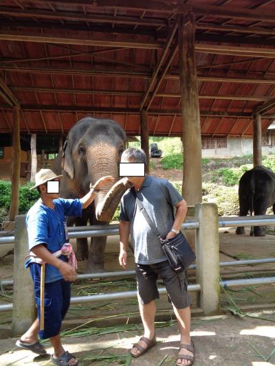 まず最初は、ゾウさんにエサをあげつつ、ゾウさんに触れ合えます。鼻を巻き付けてくれたり、帽子をかぶせてくれたり、ほっぺにチューしてくれたり、おまけに、ゾウ使いさんに渡そうとしたチップも、ゾウさんが受け取って渡してくれました。これだけでも、けっこう満足なんですが、そのあとは、ゾウさんが川で水浴びをするのを見学して、最後は、ゾウが絵を画いたり、サッカーをしたりするショーの見学となります。
