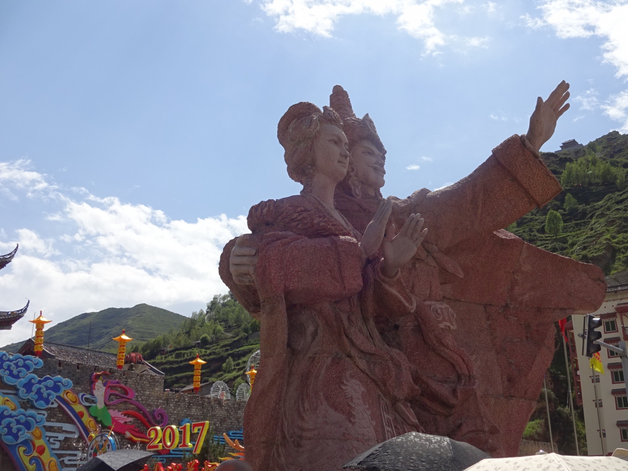 昔からある門の前には、チベット族の王様と漢族の王女様夫婦の像があります。