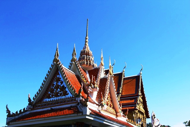 サムイ島の中では、観光寺院の色合いが強い様に感じる仏閣である。地元の人はあまりみかけなかった。大きい仏像に目が行きがちであるが、その周辺に鎮座している脇侍に鎮座している仏像や屋根に埋め込まれた仏の方が気になった。