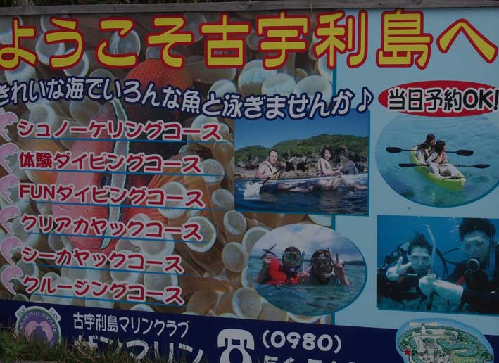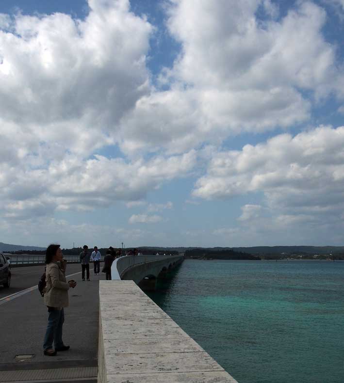 古宇利島にかかるの大きな橋で最近はこの橋の景色自体が観光名所になる感じです。緩やかにカーブした橋も沖縄の青い空と海によって引き立てられます。橋のたもとは小さな公園と道の駅のようなものもあり物産を売っていました。