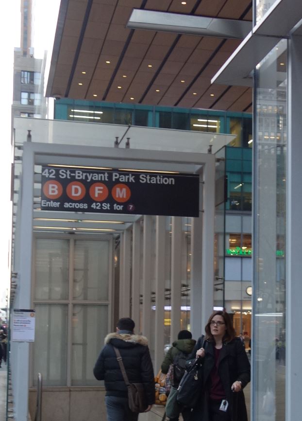 42丁目-ブライアント パーク 5番街駅(42st Bryant Park station)は六番街とニューヨーク東西を通るストリートの中でも屈指の広さを誇るW42丁目の交差点にある駅です。いつも催し物をおこなっていて賑やかなブライアントパークの角に出られます。
