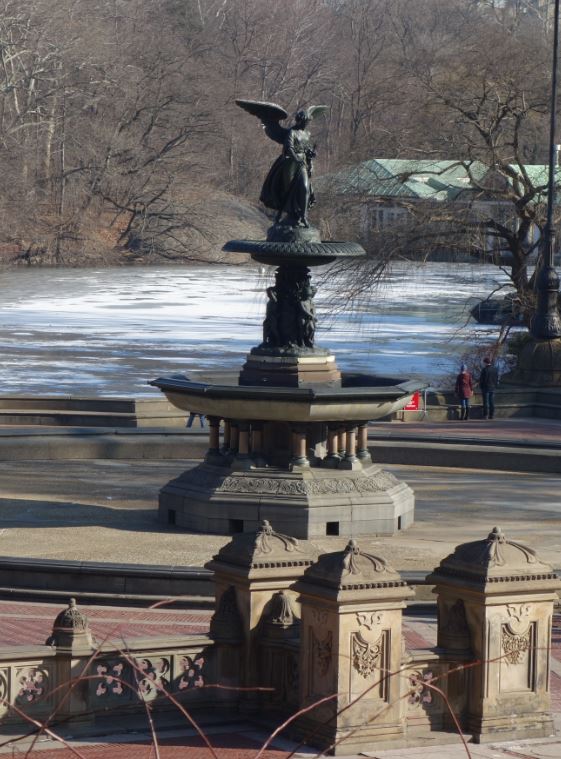 セントラルパークの中心のThe Lakeの前に建つ豪華な噴水