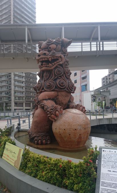 ゆいモノレールの牧志駅前で国際通りの繁華街とは反対側ですが駅前の好立地にある大きなシーサー像がさいおんうふシーサー 。できたころは素通りする人が多かったですが最近は記念写真を撮るひとが目立ちます。