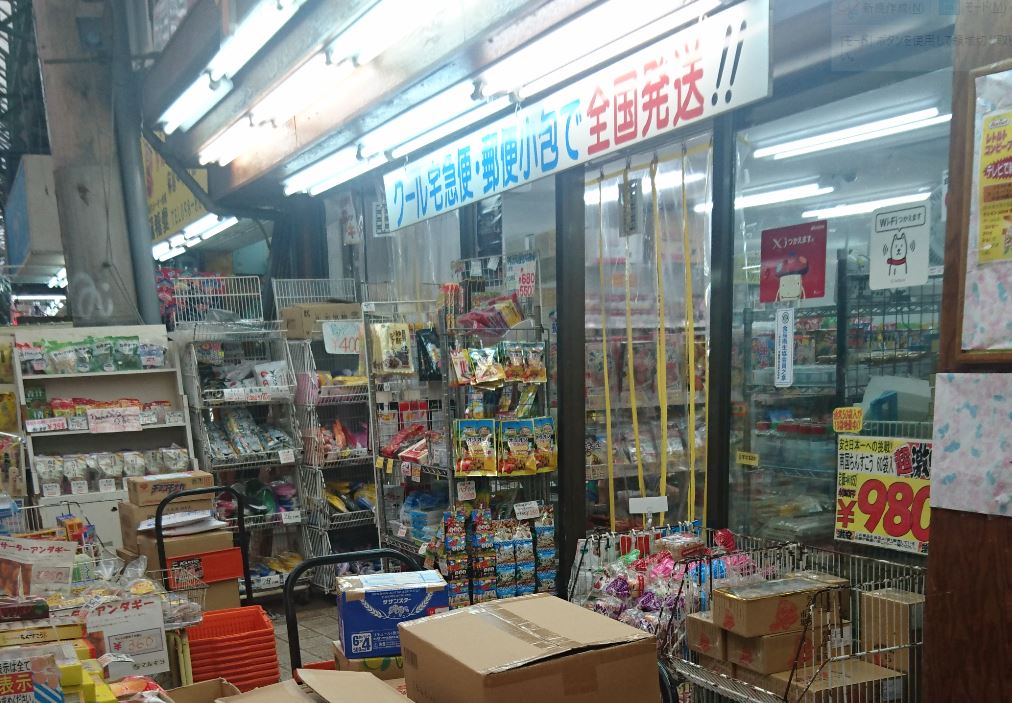 こんな短い通りでもしっかり名前があります。ビルの下のような短い露店のようなお店の前を通り過ぎると更なるカオスが待っています。むつみ橋通りやえびす通りと言った地元感満載の商店街と比べても引けの取らないローカル感です。店頭に置かれた台に見慣れないお菓子屋や調味料が並んでいます。