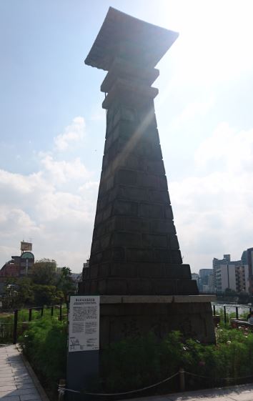 博多町家寄進高灯篭は清流公園の三角洲の最南端にある高灯篭です。この場所の為にしっくりしたような感じですが実は戦後にこの場所に移設されたそうです。寄進当時の商店の名前や屋号が彫られていてスポンサー制度の走り見たいです。少し離れた灘の川橋から正面に見る事が出来ます。