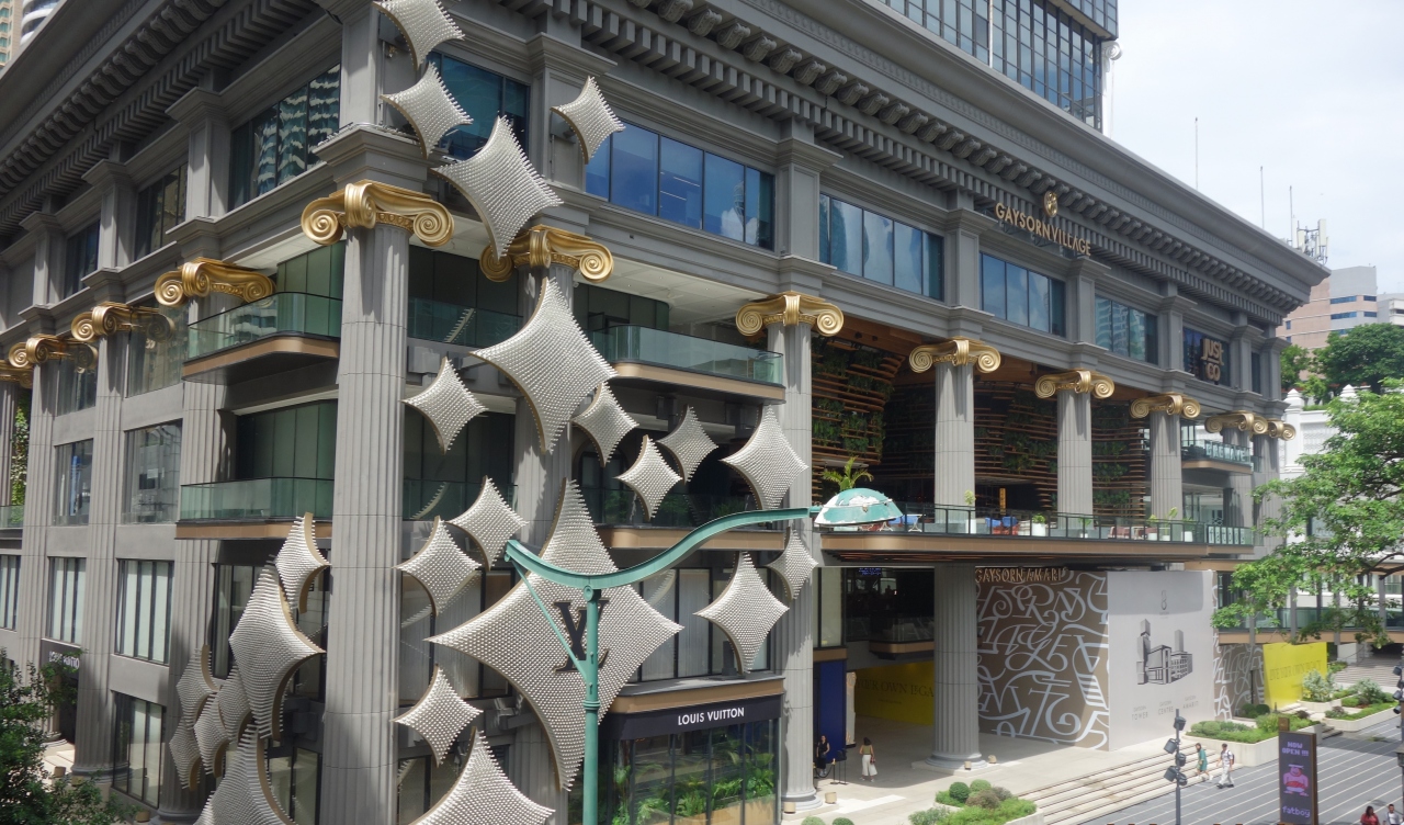 スクンビット通りを散策できるR-Walk (Ratchaprasong Walk) のエラワンの祠の向かい側にゲイソン ヴィレッジ(GAYSORN VILLAGE)があります。吹き抜けの周りに高級ブランド店舗が並んでいます。いつもは内装が独創的ですが今は更に外装が高級に衣替えしていました。