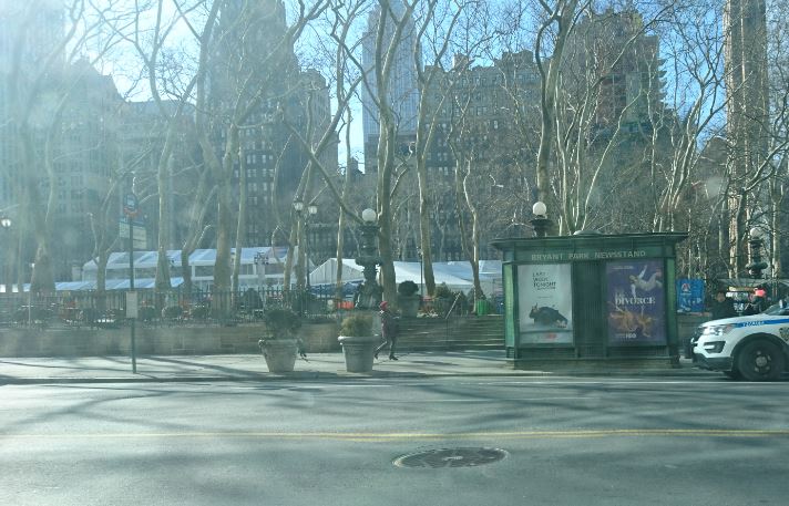 駅としても観光地としても有名なグランド・セントラル・ターミナル駅にも2ブロックあまり、また地下鉄42thの駅からすぐの好立地にあるる2ブロック程の広さの公園がブライアントパークです。クリスマスシーズンはマーケットが立ち並ぶ人気スポットに変身します。
