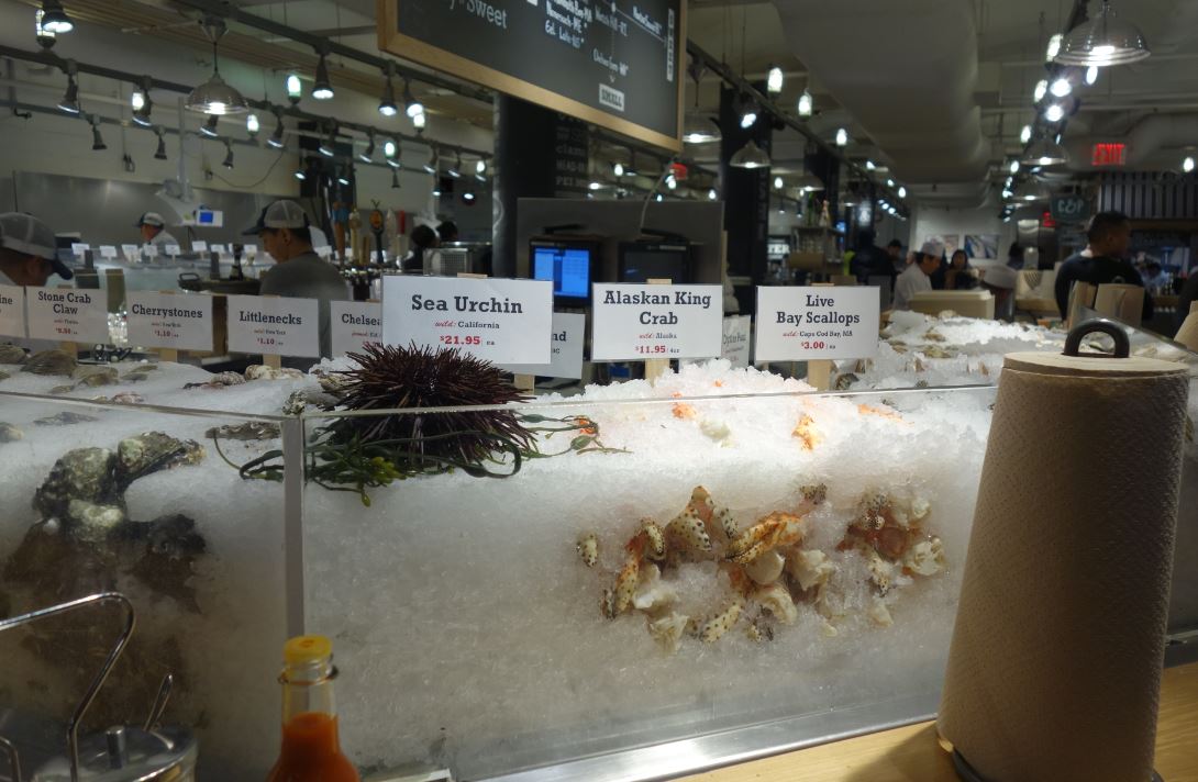 チェルシーマーケット内でリーズナブルに牡蠣やクラブを食べるならココ、カル & ピストル オイスターバー(Cull & Pistol Oyster Bar )がお勧めです。クラッシュアイスに並べられた様々な産地の牡蠣を1個からチョイスして食べられます。