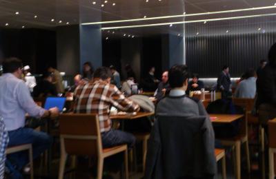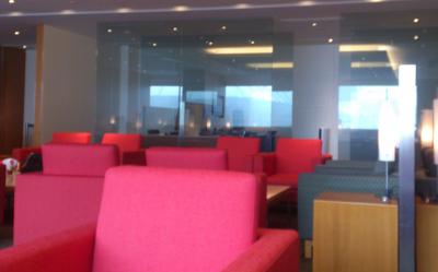 成田空港のサクララウンジ・DFSなどの階からエレベータを上がった上階にあります。あまり混雑しているのは見た事はないです。入って左側がパーテーションで仕切られた半個室スペース。右側がソファーやビジネスセンターがあって機能的な造りです。