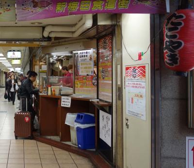 新梅田食堂街入り口、阪急百貨店前の信号にほど近いたこ焼きの人気店がはなだこです。お持ち帰りの人もいますが結構な人数がその場で焼きたてを味わっています。シンプルなたこ焼きは6個で350円、ネギマヨトッピングは450円です。並んでいても回転が速いので挑戦してみてください。